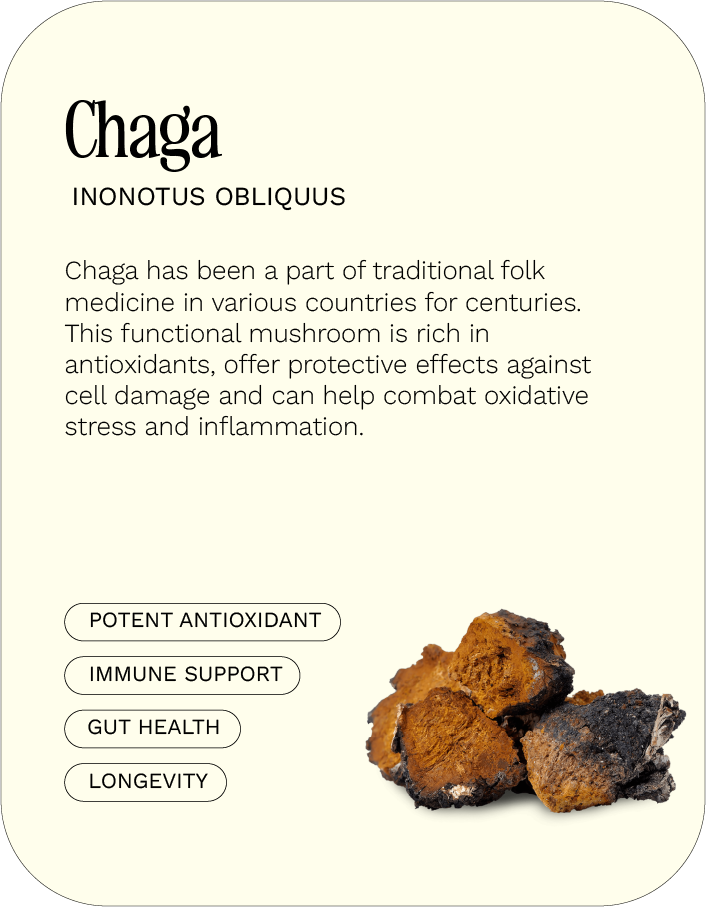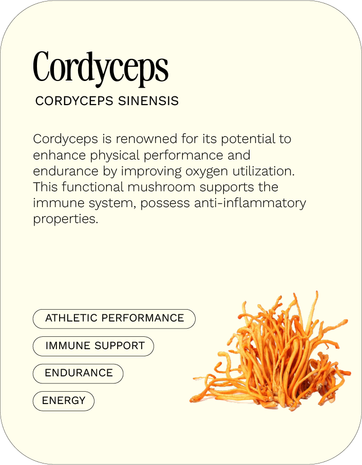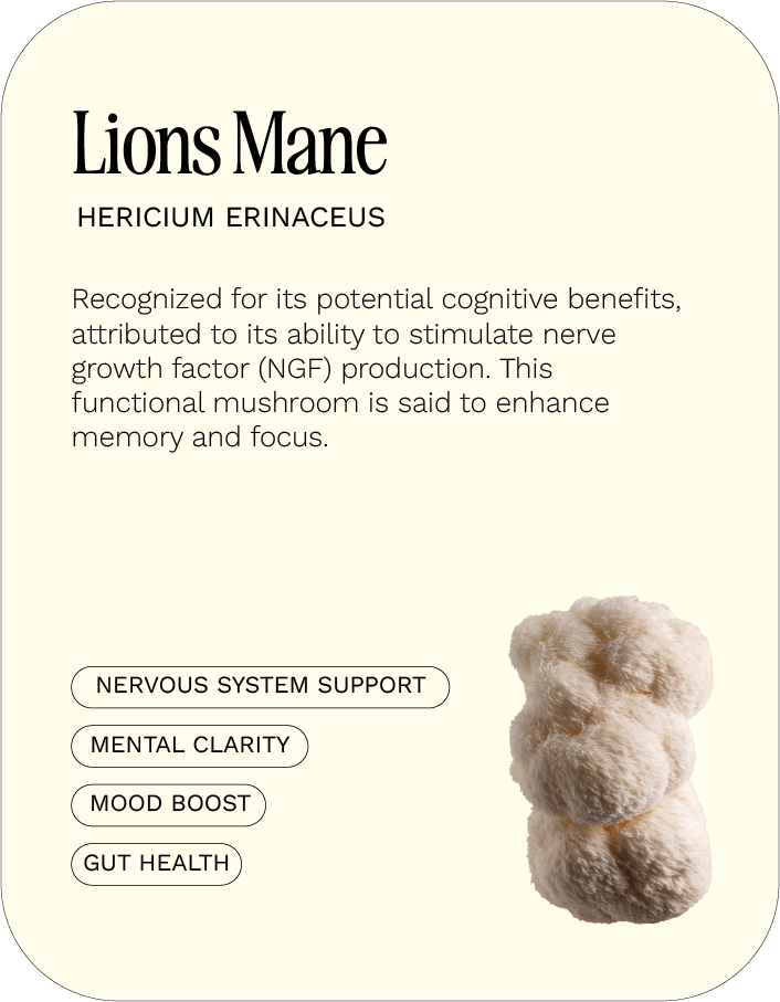 Carbonated Filtered Water, Natural Flavors, Sea Salt, Citric Acid, Tripotassium Citrate, TriMagnesium Citrate, Lions Mane Mushroom Extract, Cordyceps Mushroom Extract, Sea Salt, Chaga Extract, Reish Mushroom Extract, Stevia Leaf Extract