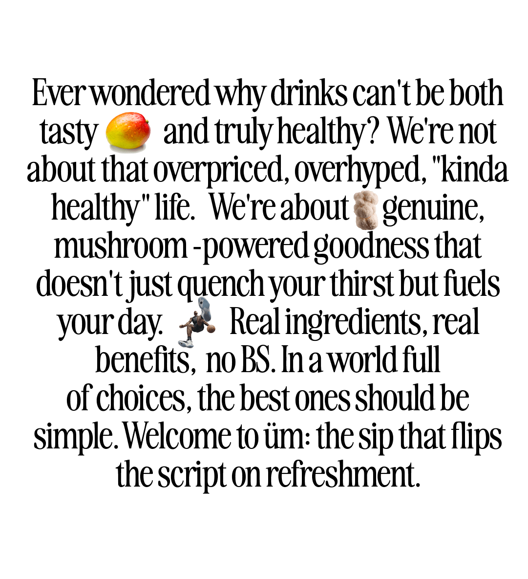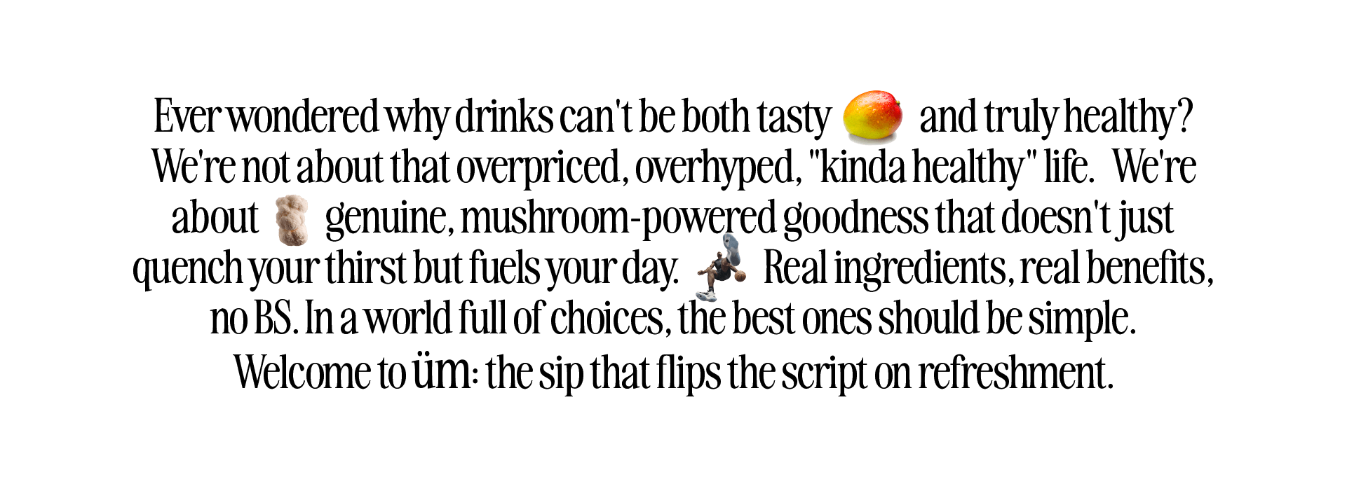 Want to know our why? After a taste-testing journey, we landed on the intentional formulation that define every sip of ÜM. This isn't just a boost; it's a lifestyle revolution. Say goodbye to the slump and hello to clarity. Dive into our story on the about page.